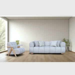 Materials: The sofa and chair are covered in a light, soft fabric, giving a comfortable…
